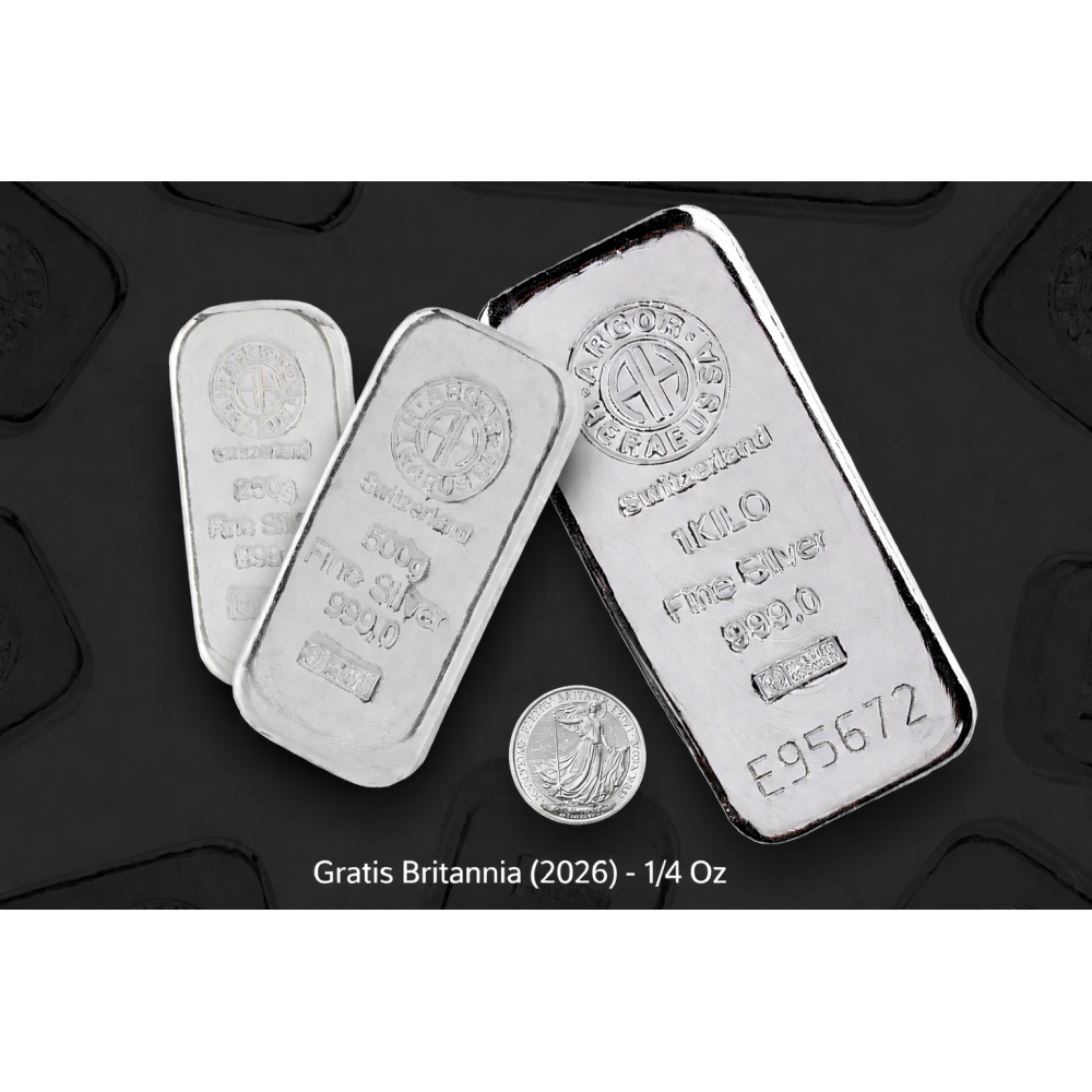 Juego de plata (1 KG + 500g + 250g Argor Heraeus) + monedas de plata Britannia de 1/4 Oz gratis