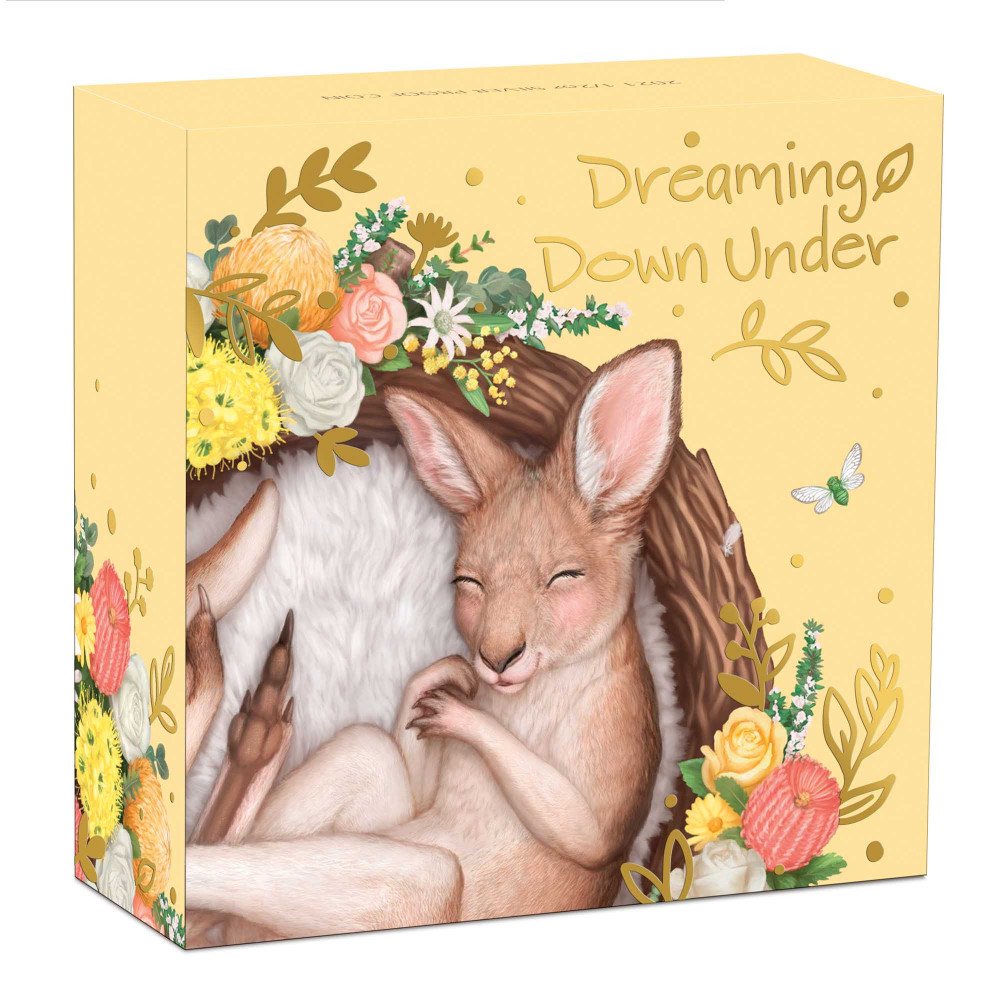 La moneda muestra un simpático canguro bebé durmiendo en una cesta de ramitas forrada de vellón, un accesorio que se ha convertido en una tendencia muy popular en la fotografía de recién nacidos entre los padres de todo el mundo. Además de la marca de ceca "P" de la Casa de la Moneda de Perth, el diseño también muestra coloridas flores y fauna australianas.