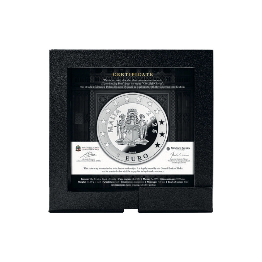 Esta exclusiva moneda de plata de 1 onza es el segundo lanzamiento de la serie "City Hall Clocks" y suena al ritmo de Londres. El Big Ben. Sublime. Inquebrantable. Atravesando el aire brumoso sobre el Támesis. Cada cuarto de hora suena "Westminster Quarters". Levanta la vista mientras los pasos resuenan en los adoquines. Respirar el aire fresco. Corazones cautivados por la onda sonora. Todavía estirado a mano. Implacable superviviente de la furia de la Segunda Guerra Mundial. Prueba de resistencia fundida en perfección Proof. La moneda va sellada en un estuche con certificado de autenticidad. Sólo 700 piezas en el mundo.