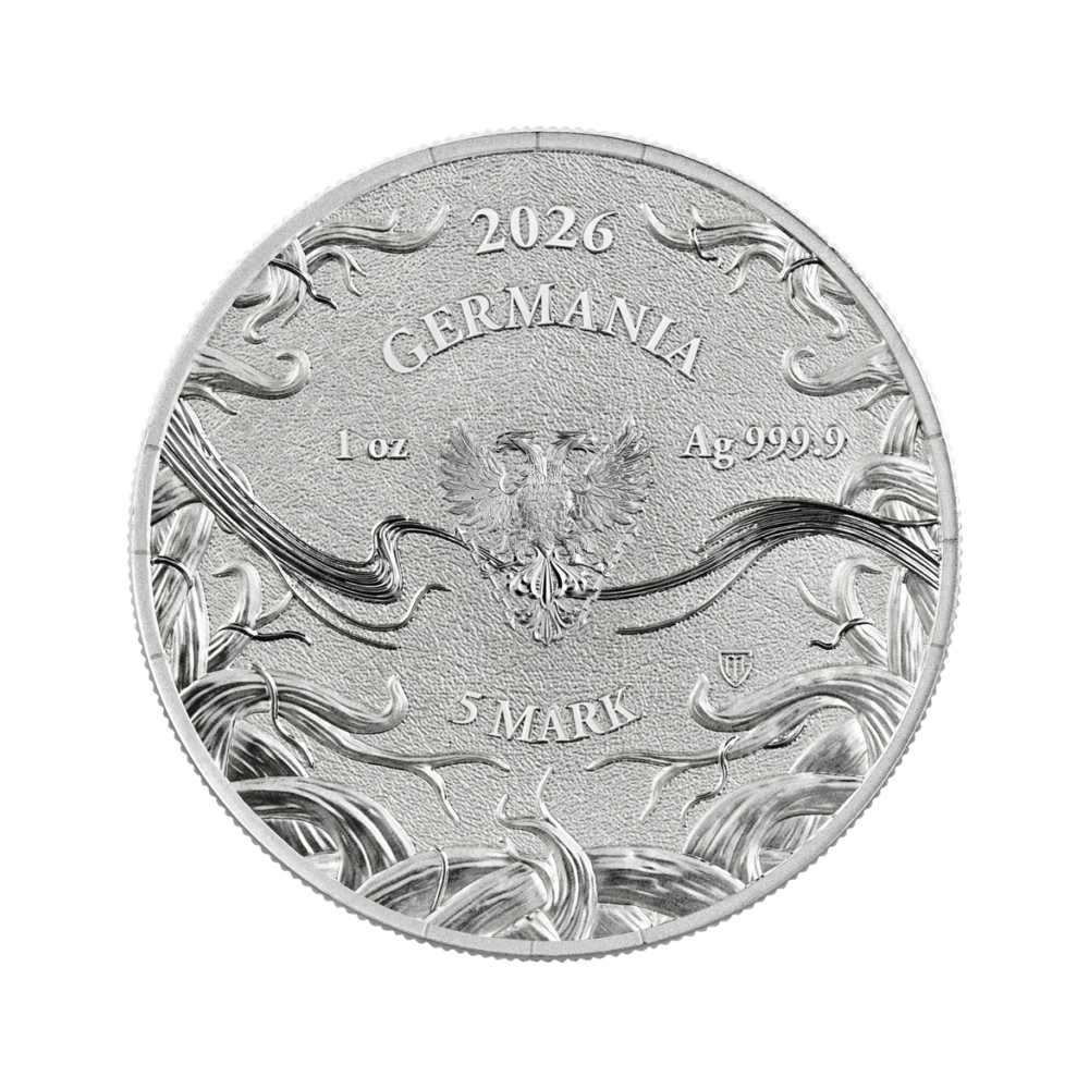 El águila bicéfala de la ceca de Germania está rodeada por las raíces de Yggdrasil y los hilos dorados del destino. Los hilos rotos simbolizan que el futuro, aunque predestinado, sigue siendo sensible a las decisiones y acciones de los seres vivos, lo que permite la posibilidad de cambiar el destino.