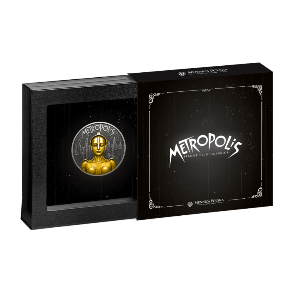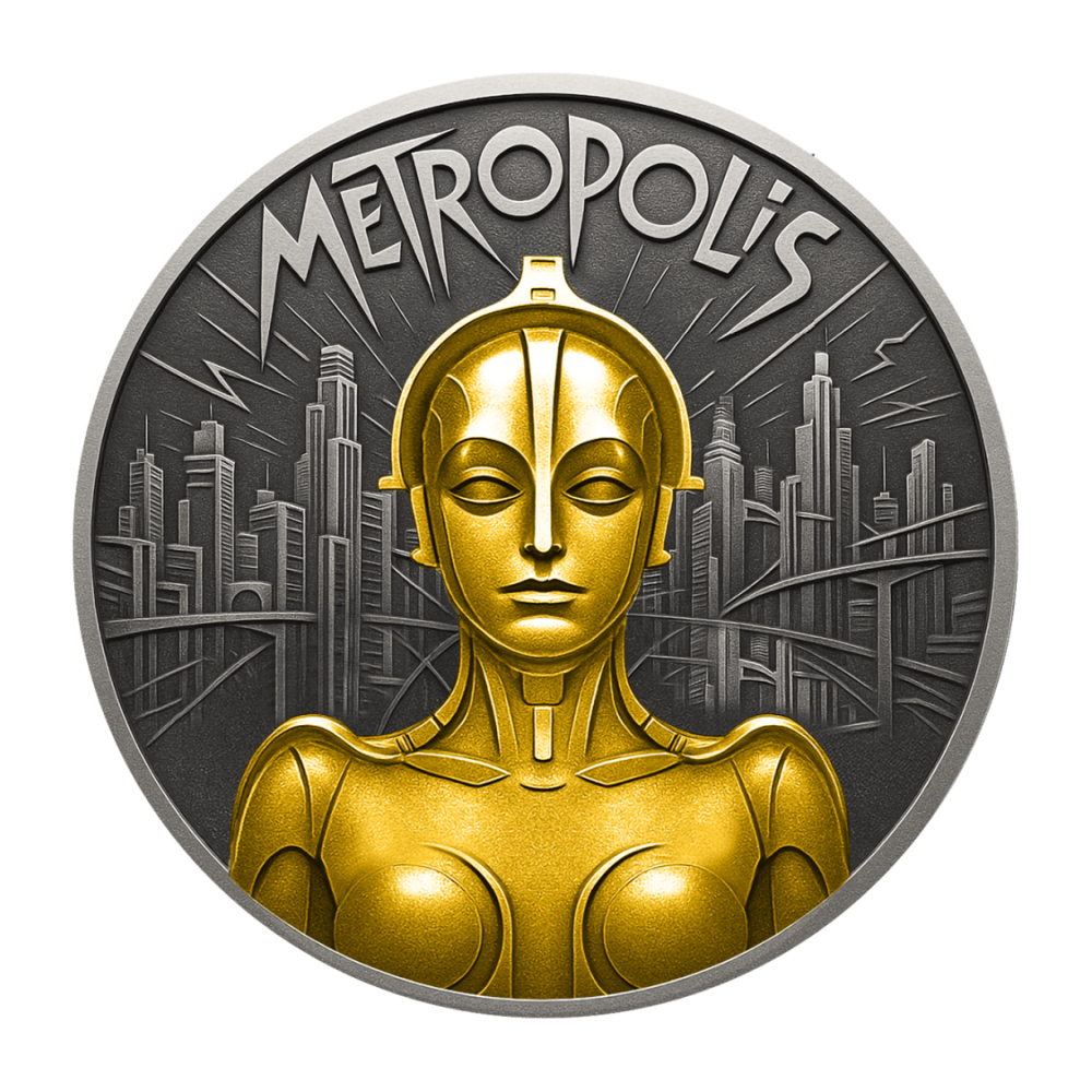 Una moneda icónica inspirada en la obra maestra de Fritz Lang. La emblemática figura de María y la geométrica ciudad del futuro están representadas en una moneda de plata de ley 999 de 1 oz con acabado antiguo y baño parcial de oro, en una edición estrictamente limitada de 500 piezas.