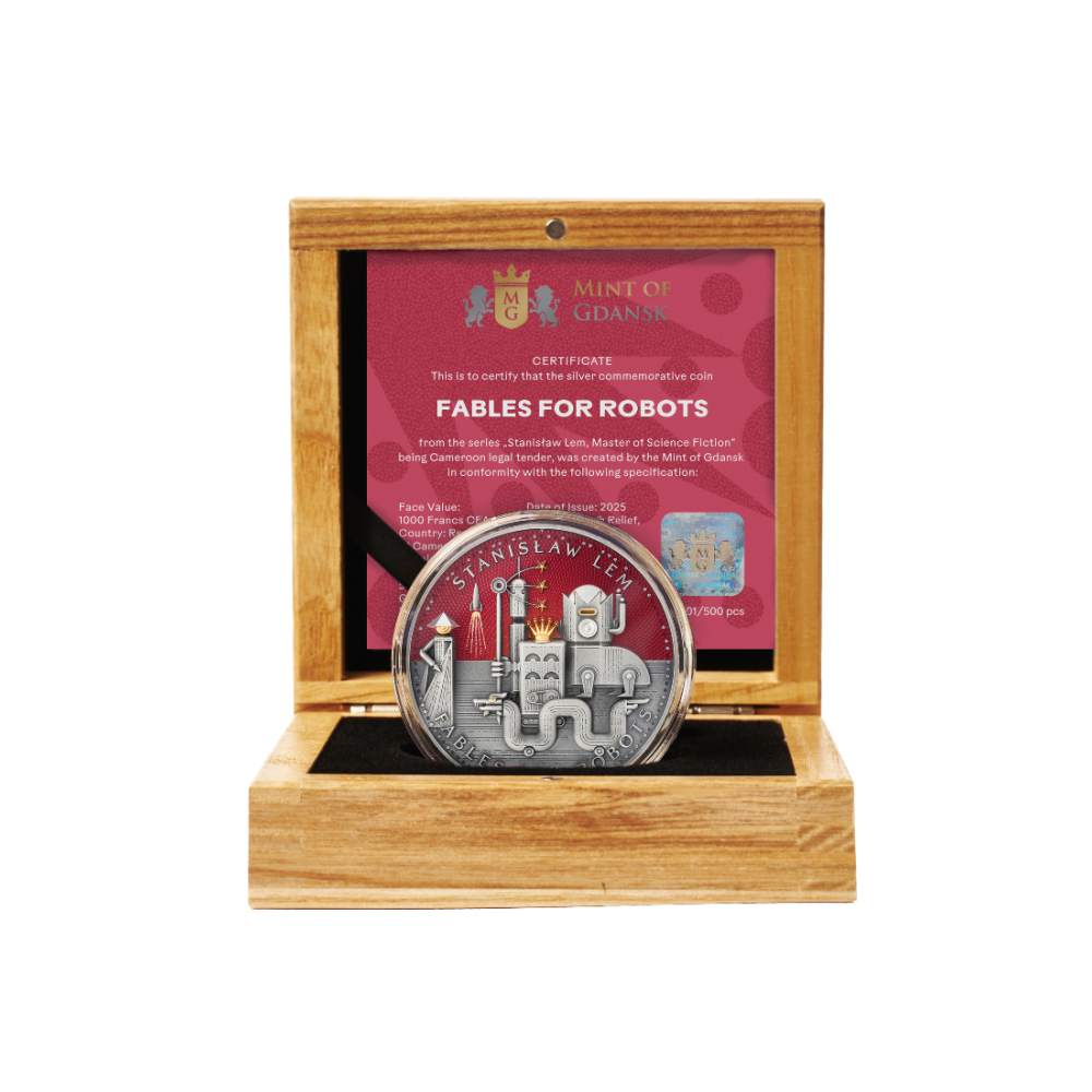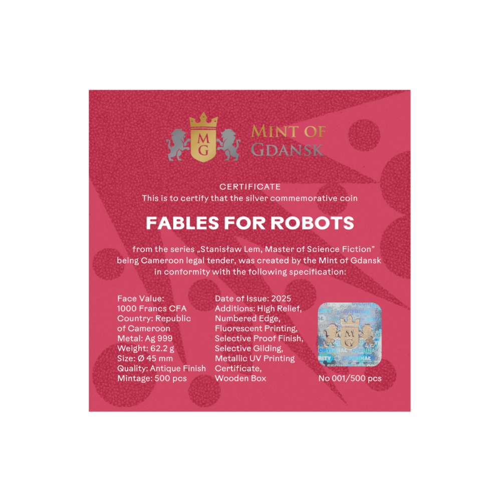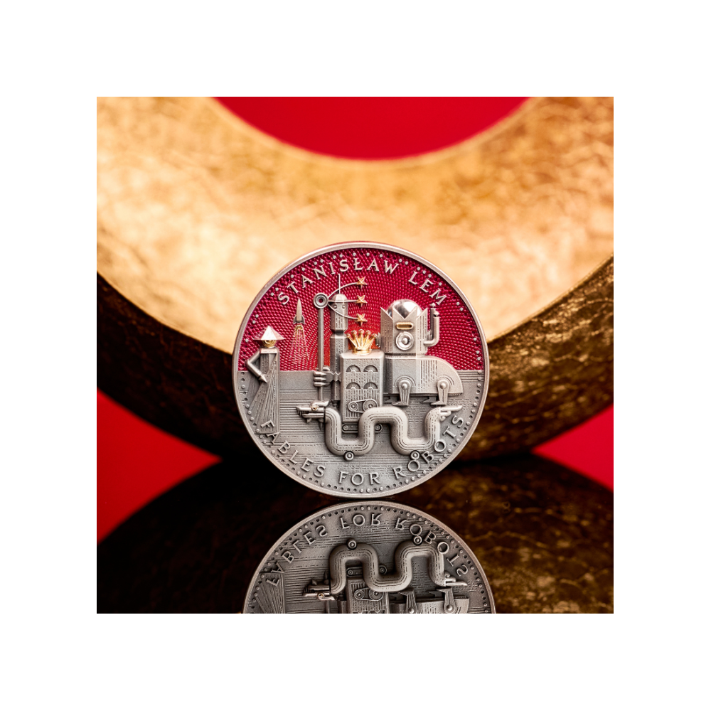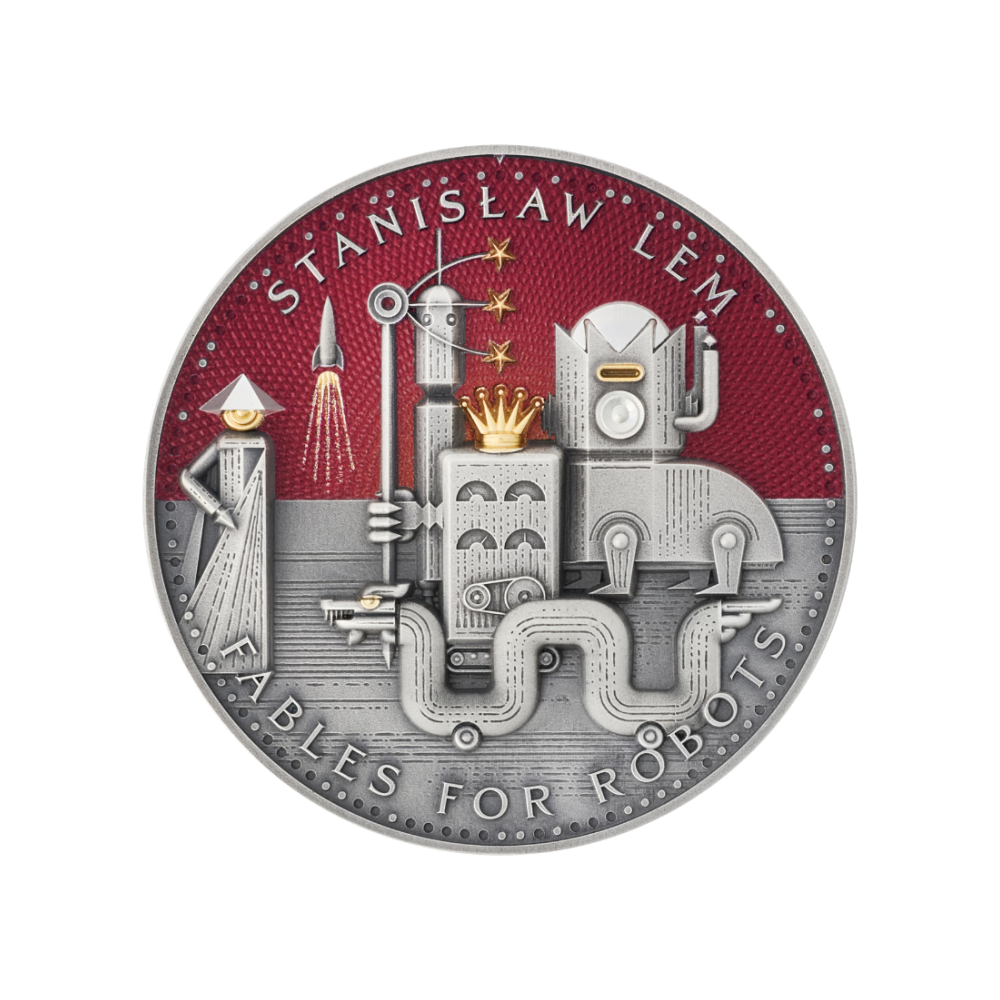 El reverso de la moneda representa una fascinante escena inspirada en la novela Fábulas para robots, una de las obras más famosas de Stanisław Lem. El motivo representa una fantástica ciudad robótica llena de monumentales estructuras mecánicas, torres de vigilancia, manos estilizadas y misteriosos ojos que todo lo ven, creando una atmósfera a la vez futurista y alegórica. Una imponente figura robótica con una corona se eleva en el centro, observando un paisaje urbano geométrico, mientras que un fondo de color rojo intenso aumenta el impacto visual dramático.