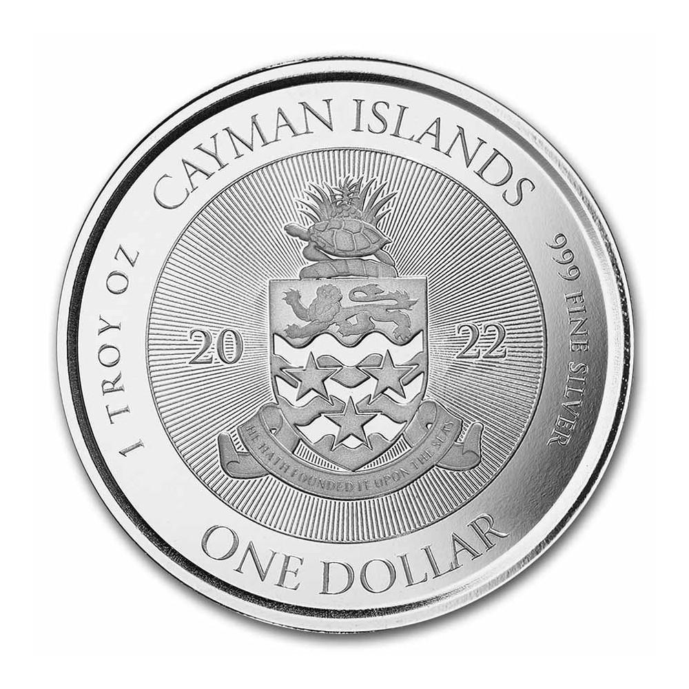 muestra el escudo de armas de las Islas Caimán junto con el peso del metal, la pureza y el valor nominal.