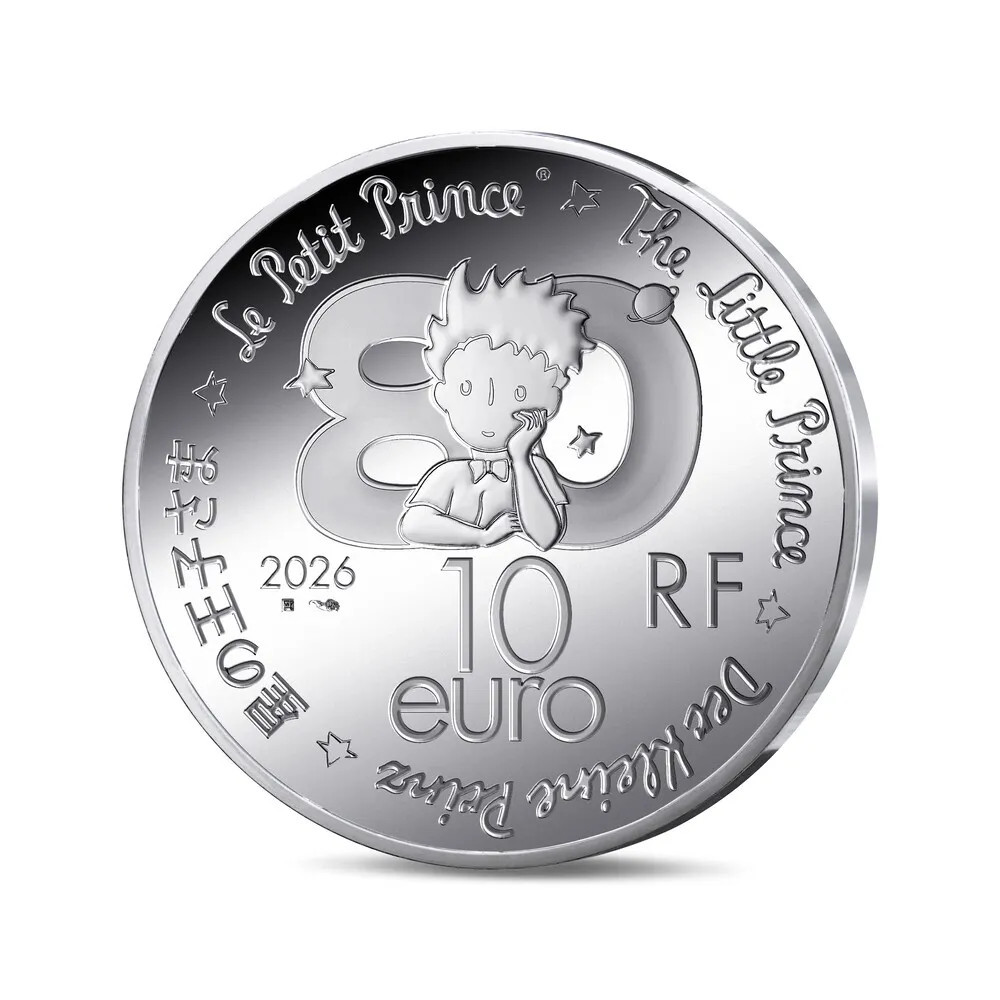 En el reverso de la moneda, encima de la denominación, figura el logotipo del 80 aniversario del Principito, que consiste en un busto de la figura apoyado en su brazo delante del número 80. A lo largo del canto, la inscripción "El Principito" en francés, inglés, alemán y japonés recuerda la dimensión universal de esta figura. También aparecen la marca RF, las marcas del taller del grabador y del maestro grabador, y el año 2026.